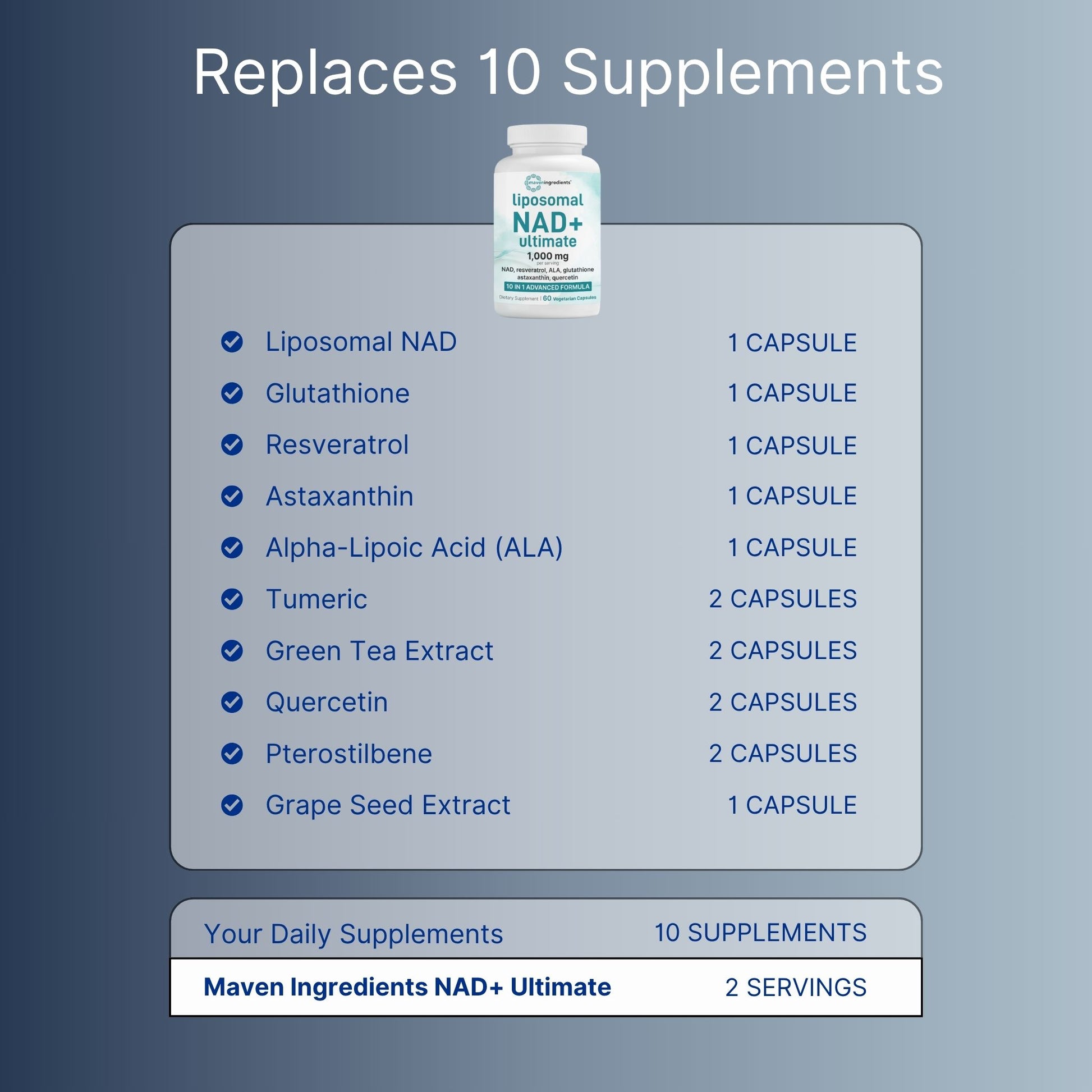 vs Tru Niagen ($50+): They use NR (a precursor). We use direct NAD+ in liposomal form. Plus, we're 10-in-1—glutathione, resveratrol, astaxanthin, ALA included. They charge $50 for NR alone.
